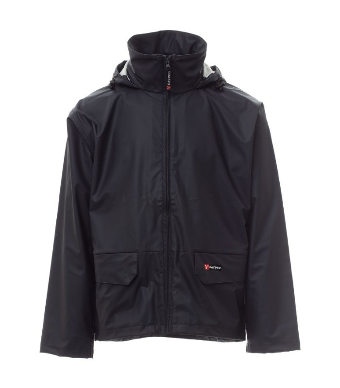Giacca anitpioggia, zip intera coperta, in plastica con cursore in metallo, cappuccio richiudibile nel colletto, coulisse in vita, fondo manica dritto con con polsino elasticizzato interno, due tasche a busta, cuciture termosaldate.