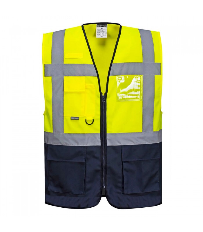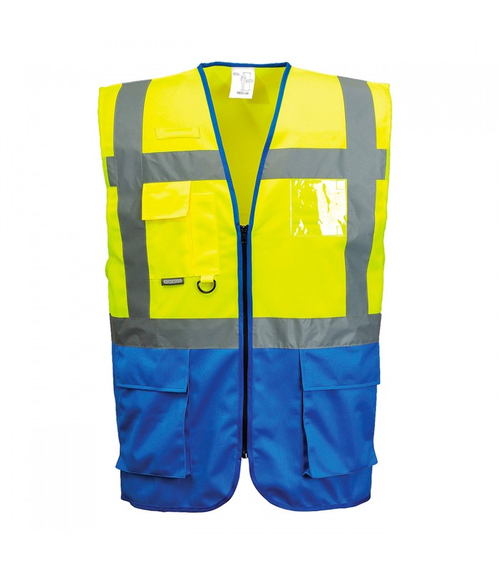 Gilet bicolore multitasche in maglia di poliestere, con bande REFLEX orizzontali e verticali, con sette ampie tasche anteriori, chiusura centrale con zip, tasca porta cellulare, porta penne, porta badge.