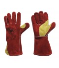 Guanto in crosta rosso da saldatore - Con Palmo rinforzato - Qualità extra - Foderato internamente con tessuto ignifugo felpato - Pollice ad ala - Filetti salvacuciture - Manichetta di sicurezza 14 cm con supporto interno in tela e bordo orlato, lunghezza 35 cm.